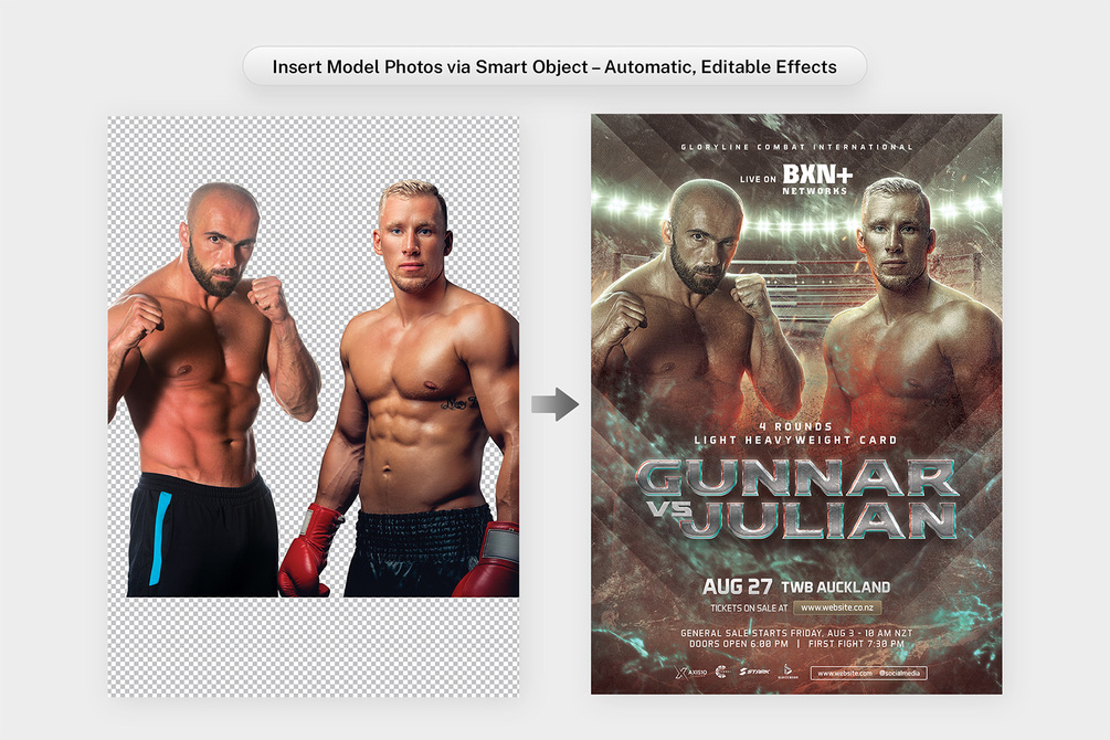 Promote your upcoming boxing match with this professionally designed Boxing Fight Card Flyer Template for Photoshop. It includes two fully editable layouts—one for the main face-off and another showcasing the full fight card, including co-main and preliminary bouts. Comes in A4 and 8x10” (4:5) sizes. While A4 is tailored for print, the 8x10” format offers a versatile 4:5 ratio that fits well for both print and social media or digital display needs. Smart Object layers make customization fast and easy.