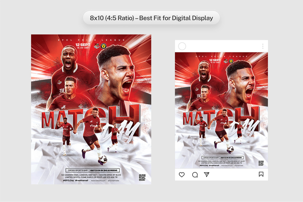 Get fans excited for the big game with this Football Match Day Flyer Template PSD. Built for maximum impact, the design features bold typography, dynamic player cutouts, and modern lighting effects that capture the intensity of football. Whether you’re promoting a live screening, a local tournament, or a sports club event, this template gives you a professional look in minutes.