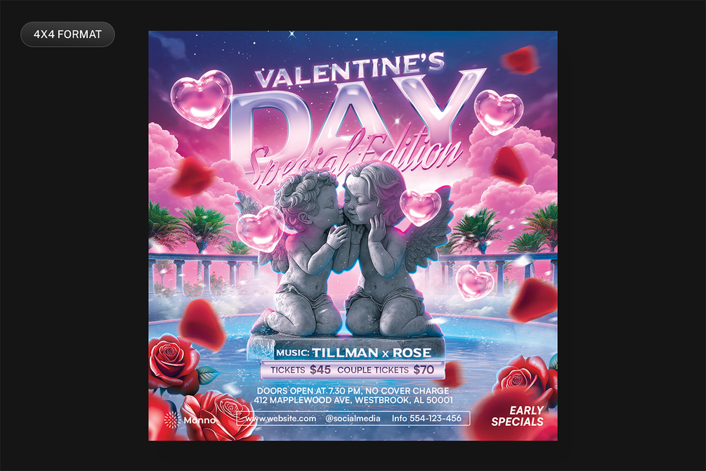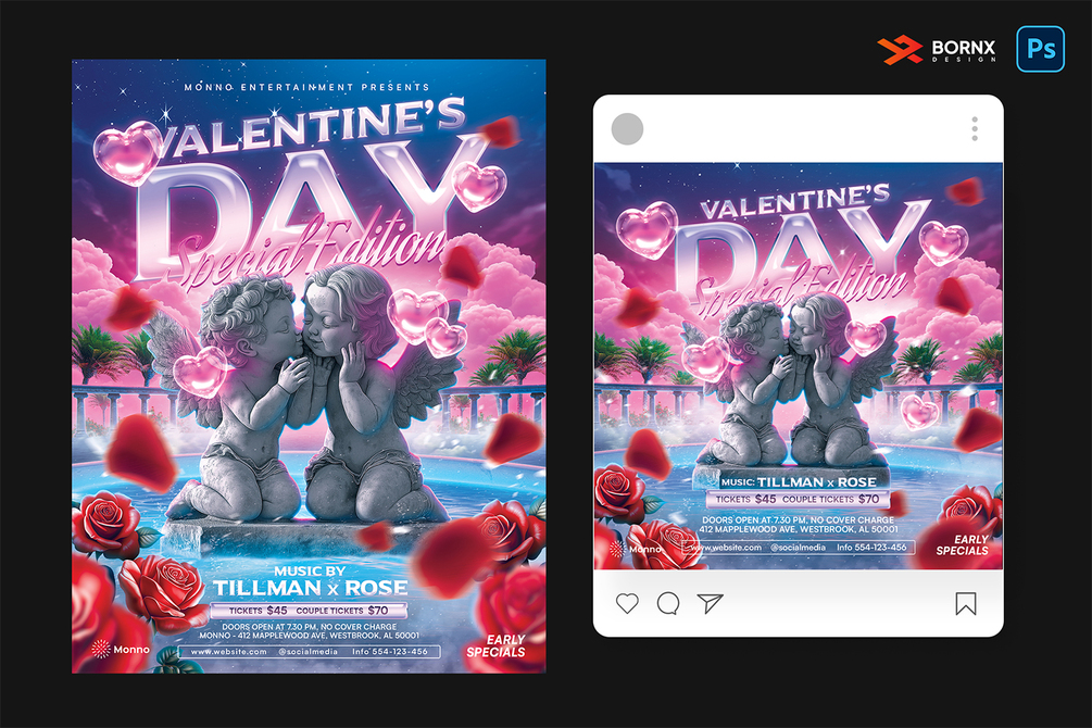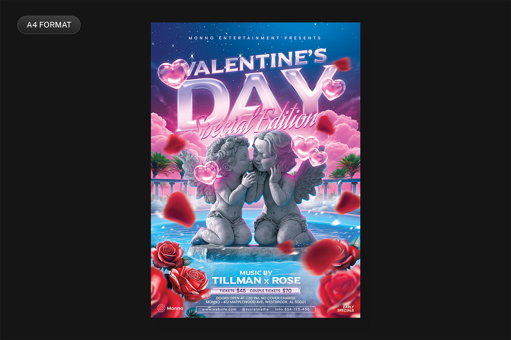 Celebrate love in style with this Valentine's Day Flyer Template! Perfect for creating stunning valentine flyers or a captivating valentine party flyer, this design offers an elegant touch for any romantic event. Whether you're planning a party, a concert, or a special gathering, this valentine flyer template provides everything you need. Available in US Letter, A4, and square formats for social media, it’s 100% editable in Photoshop with high resolution (300 DPI) in CMYK and RGB modes. Perfect your valentine flyers design and make your event unforgettable!